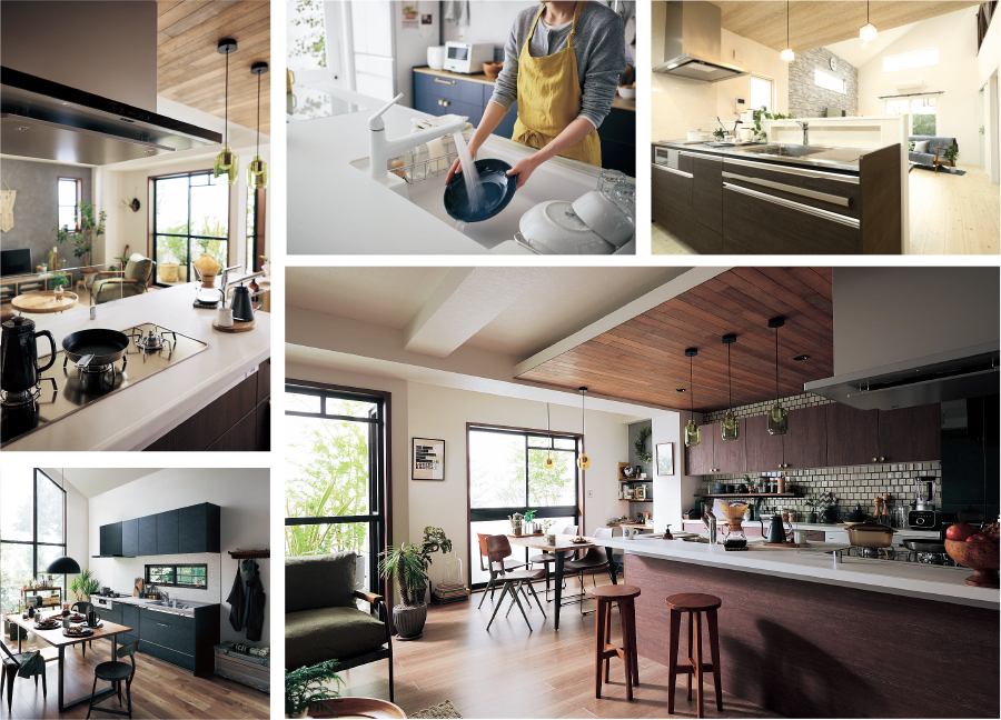 たくさんのシステムキッチンが各メーカーから発売されていますが、カウンター、シンク、水栓、キャビネット、コンロ、レンジフード等の基本的な仕様は変わりません。なので高級感のあるカウンターや水はねの少ないシンク、便利な収納など、自分のこだわりたい所を整理して選ぶことをおすすめします。各メーカーでオリジナル機能もありますので詳しくはご相談ください。